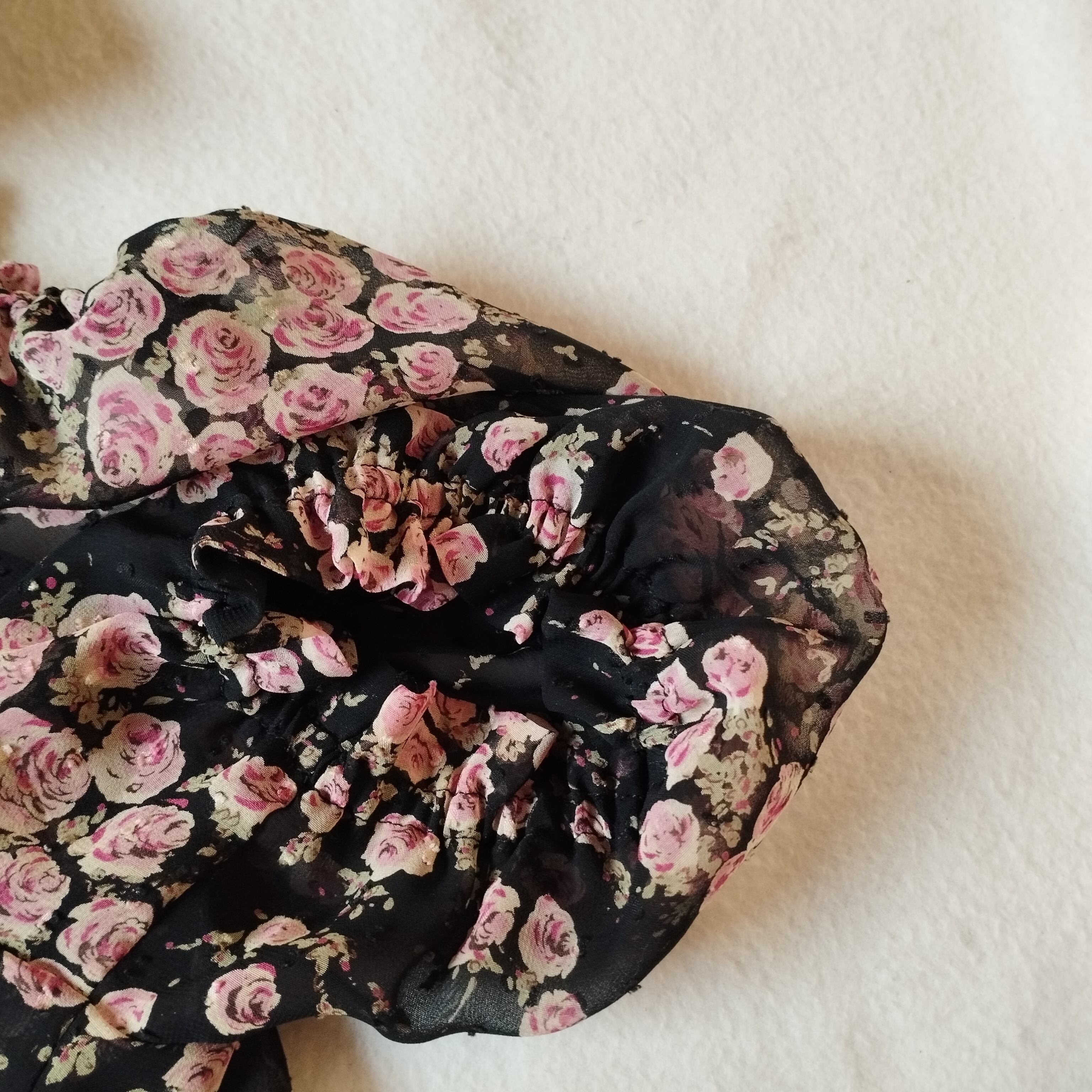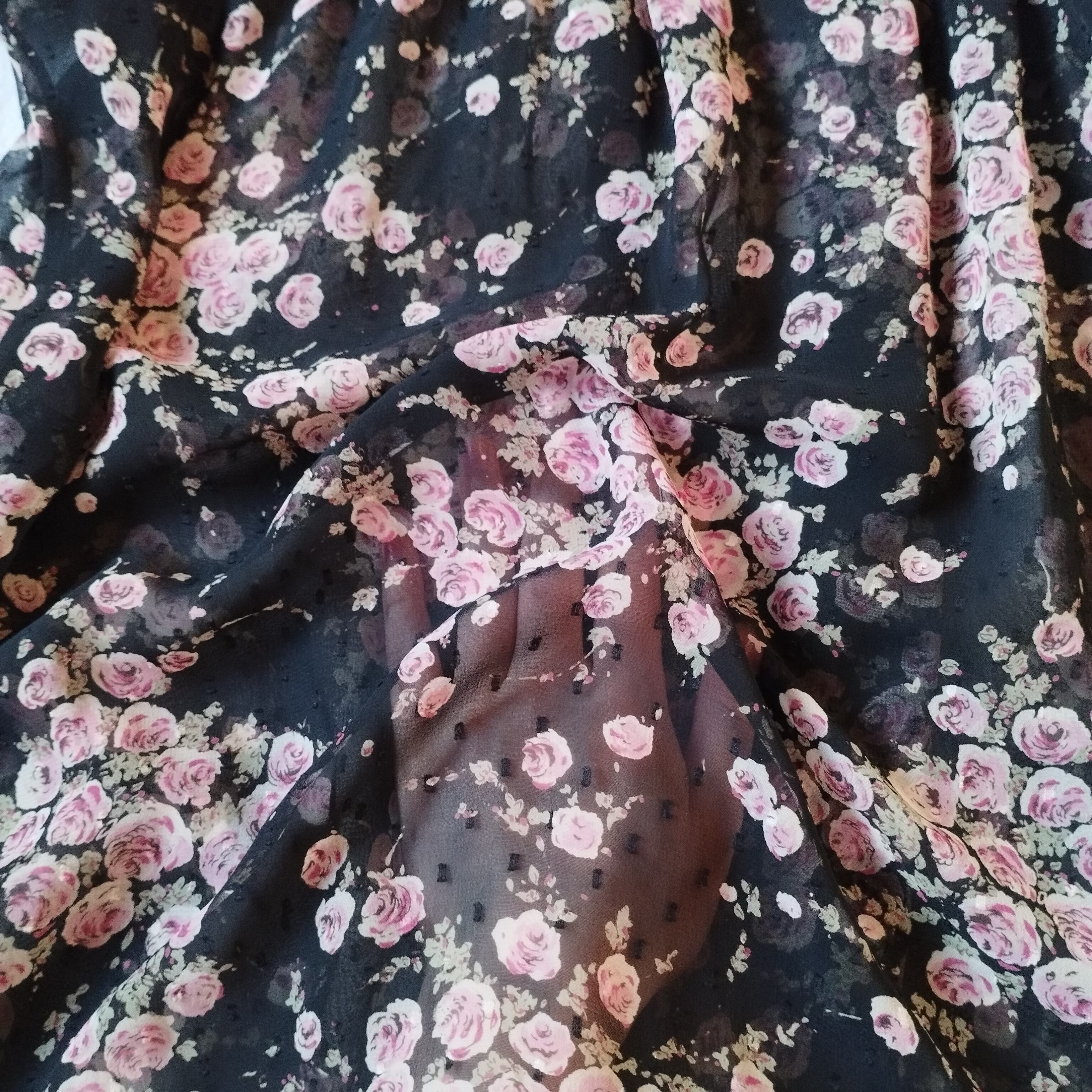 透け感のある素材に、愛らしいローズ柄がデザインされたワンピースです。軽やかな素材感なので、これからの季節には特に活躍します。