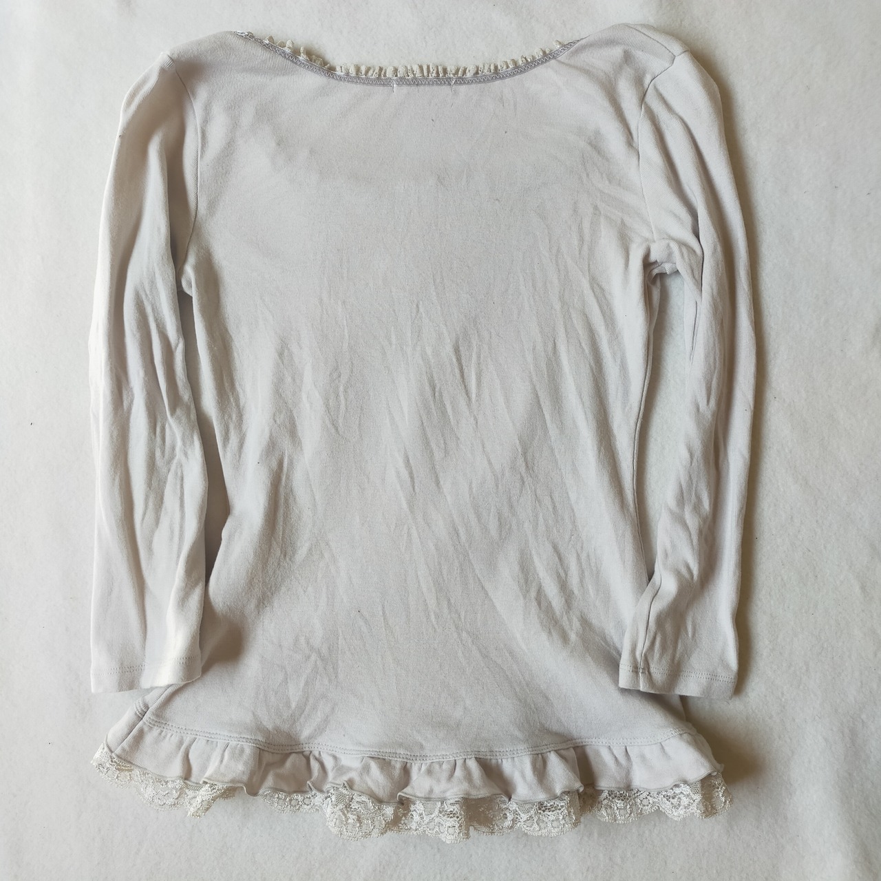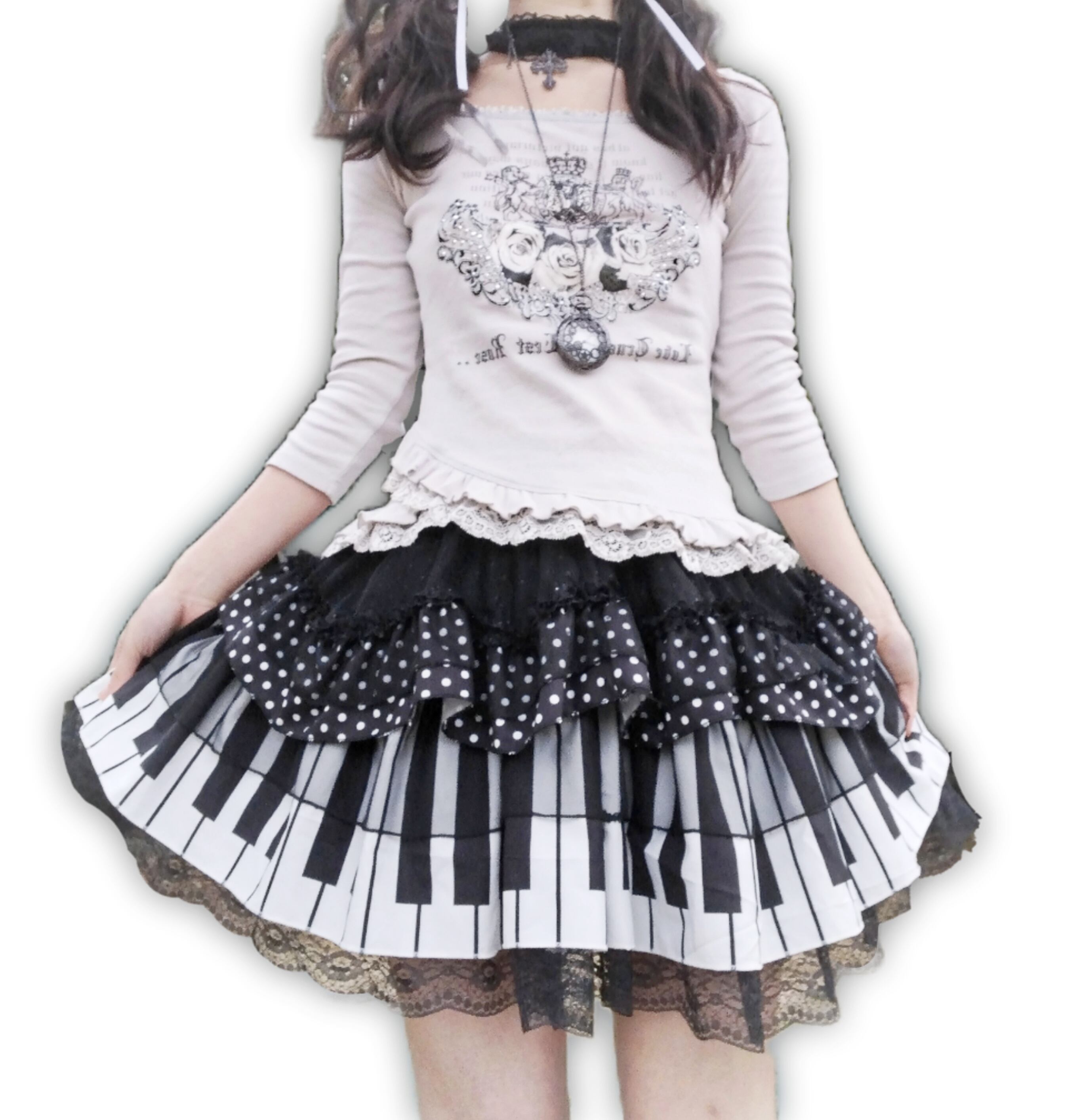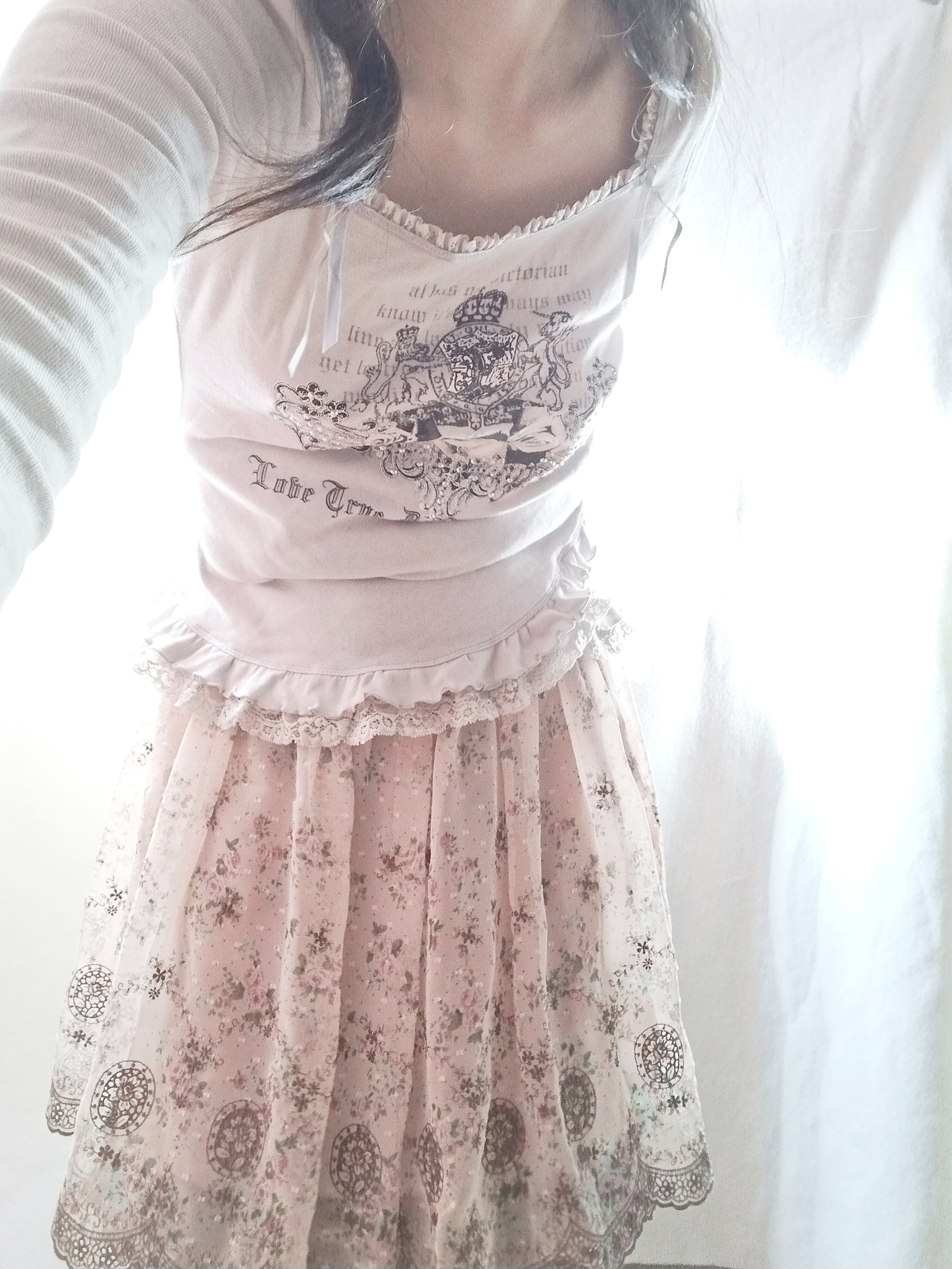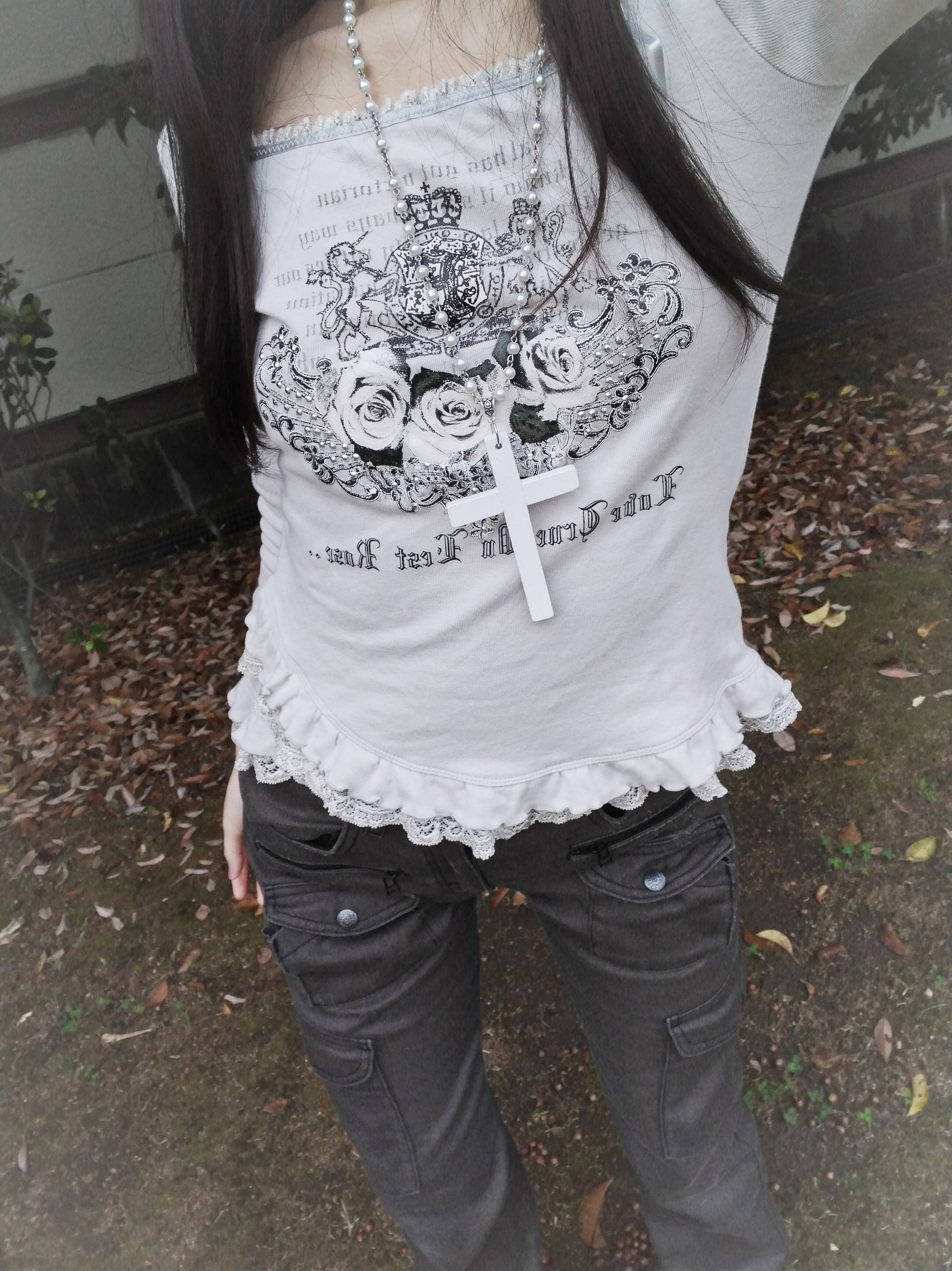 繊細なボリュームレースと美しい薔薇の英字プリントが施されておりスカートにもジーンズにも合わせていただけるトップスです♡画像1と3のスカートは別売りしてますのでよろしければご覧ください♡